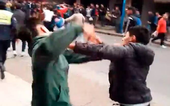 Lo que comenzó como rivalidad entre las instituciones educativas escaló rápidamente cuando, en plena calle y con la presencia de la Policía, los estudiantes se enfrentaron de manera violenta, llegando incluso a amenazar con el uso de armas blancas. A pesar de la presencia policial, el enfrentamiento continuó sin que llegaran los refuerzos necesario para controlar la situación.