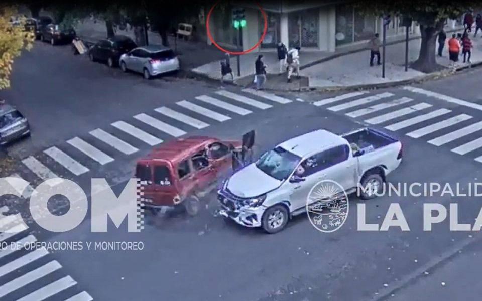 Ocurrió en 7 y 55 y la secuencia quedó perfectamente grabada en una cámara. Allí, se ve con claridad como un utilitario Peugeot Partner que circula por 55 y cruza la avenida correctamente es embestido muy violentamente por una pickup Totoya Hilux.