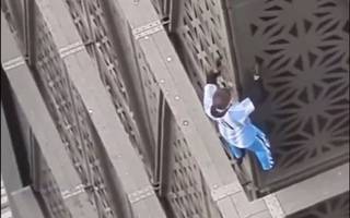 El hecho ocurre en Madero al 1100. La persona, vestida con una camiseta de Argentina, no tiene red ni sogas que lo aten.