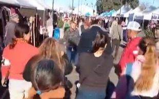 En los videos a los que accedió EL DIA se observa un gran número de personas reunidas en la feria dialogando con el apuntado de pedirles dinero, hasta que deciden invitarlo a retirarse con cánticos e insultos.