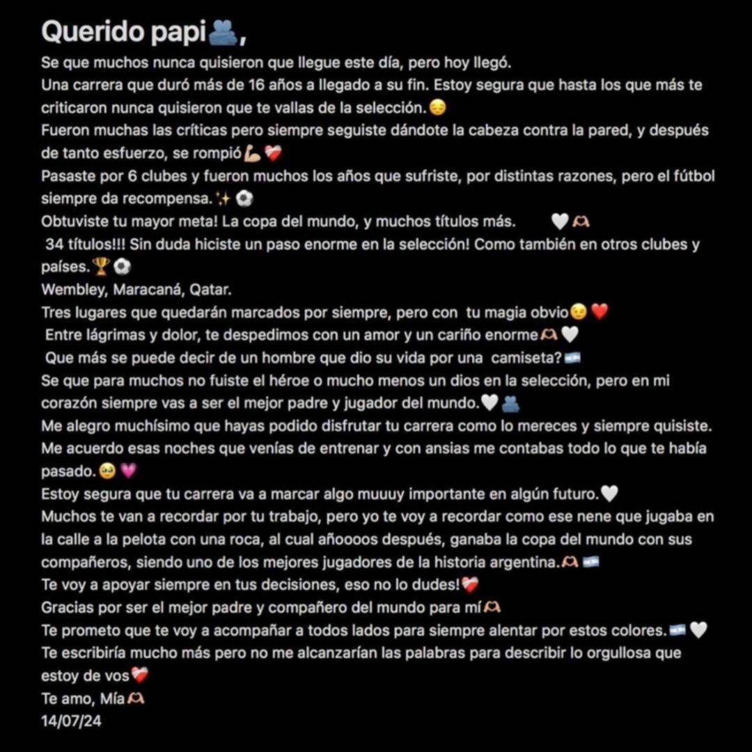 Por eso, su hija Mía, fruto de su matrimonio con Jorgelina Cardozo, compartió una carta para el ídolo que hizo emocionar a todos. La publicó en Instagram y fue reposteada por su padre.