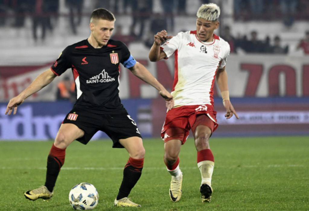santiago ascacíbar disputando la pelota con eric ramírez. el pincha no pasó del empate en parque patricios / fotobaires