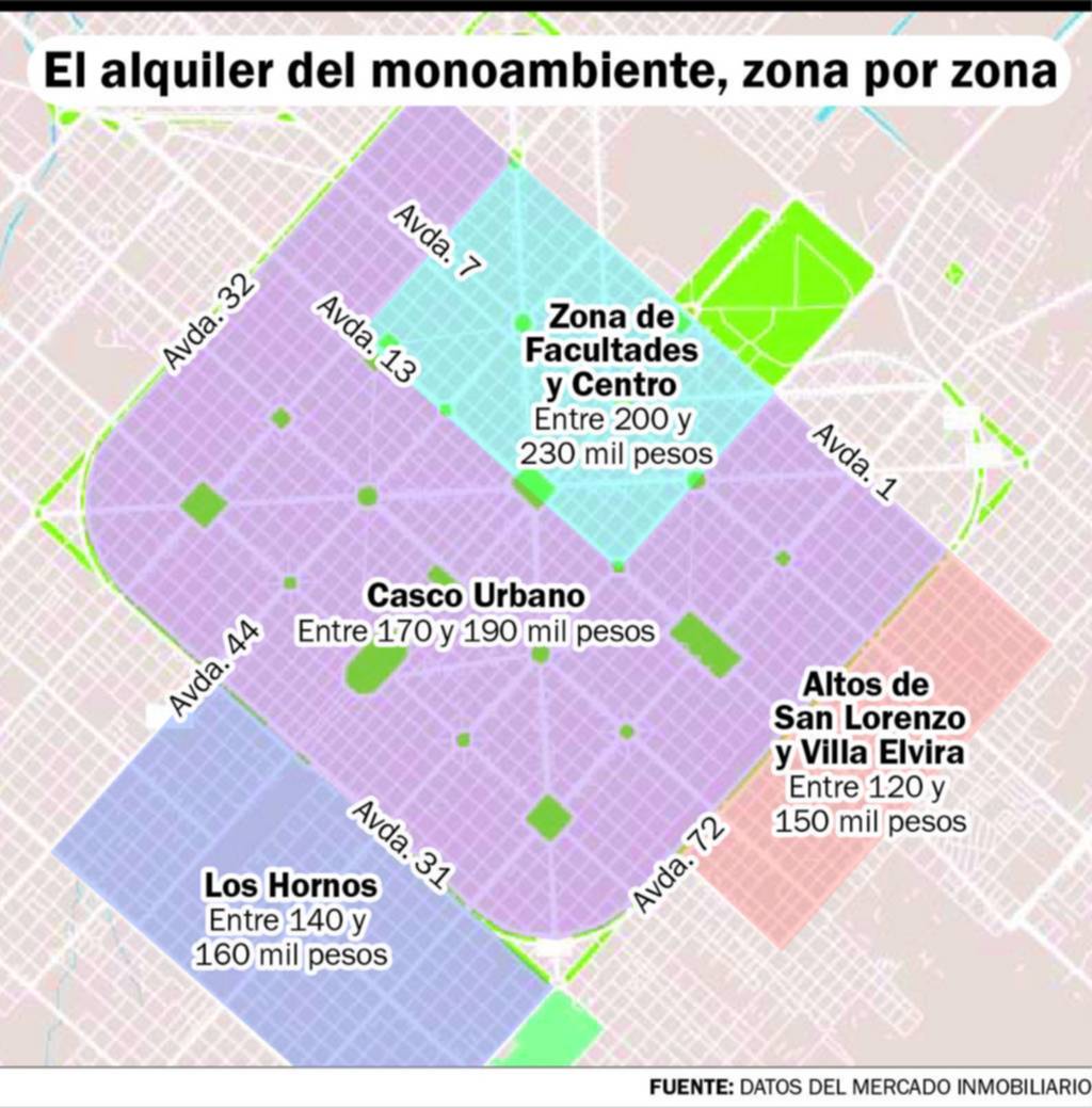 En la periferia, por ejemplo Los Hornos, el precio puede estar entre los 140.000 y 160.000 pesos. En Altos de San Lorenzo y Villa Elvira los precios rondan entre los 120.000 y 150.000 pesos.