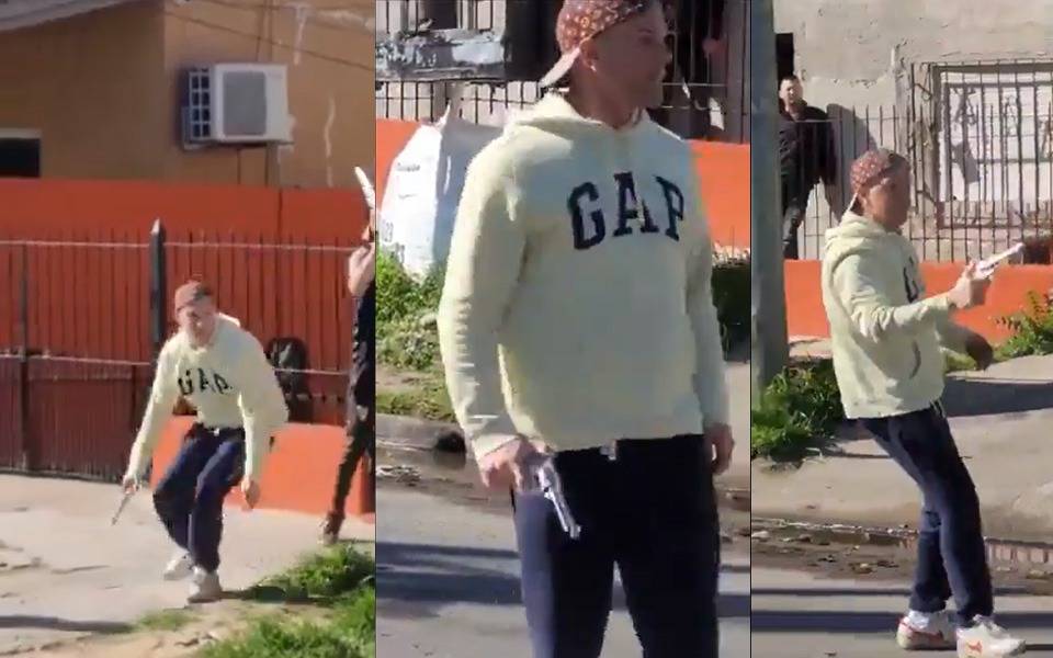 El hecho se produjo el pasado sábado por la mañana en la cercanía de 5 y 140, de Berazategui. Ante los reiterados cruces y la escalada del conflicto, los vecinos alertaron a los efectivos del 911. En las imágenes se ve como el implicado y un cómplice amenazan a los diferentes vecinos con armas blancas y luego con dos armas de fuego.