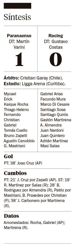 El dominio ejercido durante buena parte del partido, en particular a lo largo del primer tiempo, no le alcanzó a Racing para evitar una derrota por 1-0 en su visita a Athletico Paranaense, de Brasil, en el inicio de la serie por cuartos de final de la Copa Sudamericana que seguirá el próximo jueves en Avellaneda.