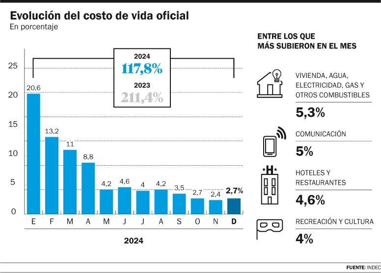 La inflación de diciembre fue de 2,7% y acumuló 117,8% en 2024, informó el INDEC. La variación mensual mostró una aceleración de 0,3 puntos porcentuales contra el mes previo, que había registrado 2,4%, el dato más bajo desde julio de 2020 -en plena cuarentena estricta por la pandemia de coronavirus-, cuando el IPC había marcado 1,9%.