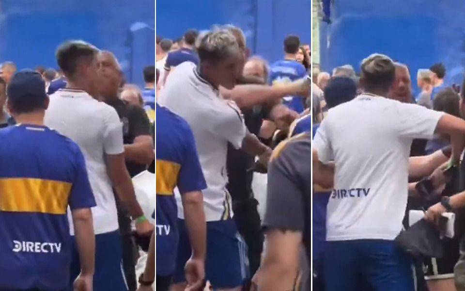 En las imágenes se puede ver cómo un hombre mayor le grita y termina pegándole en la cara al joven influencer mientras un grupo de hinchas buscan separarlos.