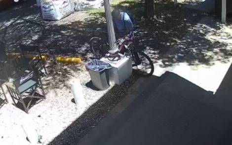 En un instante de descuido, las cámaras de seguridad capturaron a un joven acercándose al rodado. Mientras se asegura que no lo viera nadie, comienza a forcejear hasta que logra abrir el candado con el que estaba atada.