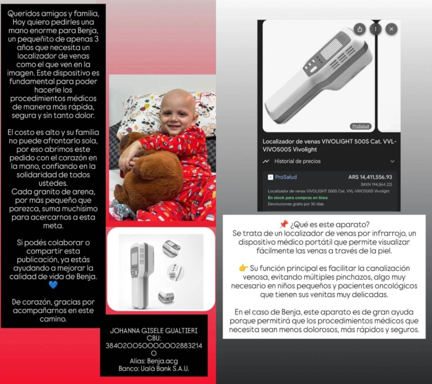 “Hoy venimos a pedirles algo muy importante: Benja está en tratamiento oncológico, y como él, muchos nenes atraviesan la misma lucha. Uno de los momentos más difíciles es cuando necesitan canalizarlos: sus venitas ya no resisten, y lo que debería ser un solo pinchazo se convierte en muchos intentos dolorosos”, comenzó el pedido de su madre, Johanna.