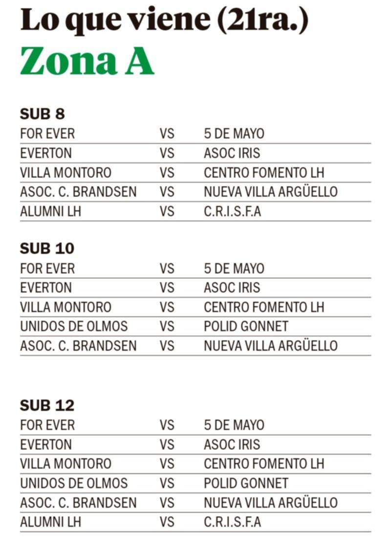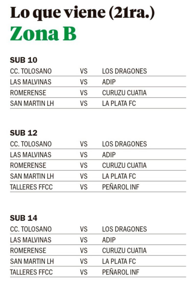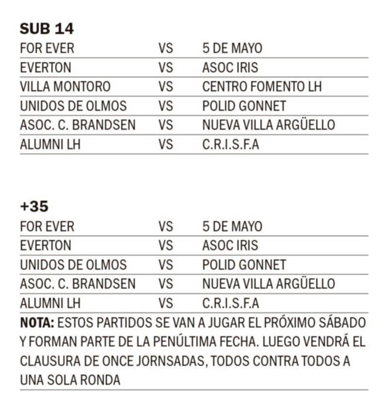 Si el tiempo acompaña, el sábado que viene definirán su suerte en el Torneo Clausura la Sub 10 de Brandsen (Zona A) y la Sub 14 de For Ever (Zona A); la Sub 10 del Círculo Tolosano (Zona B); y el + 35 del Fomento.
