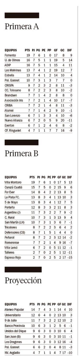 En la máxima categoría, el líder Fomento será local de CRISFA, en 58 y 132, con arbitraje de Nazareno Chavarría. Mientras el escolta Unidos de Olmos también será el anfitrión, pero en 43 y 184. El Azulgrana juega frente a ADIP que también viene cerca y dirige Lautaro Montes De Oca.