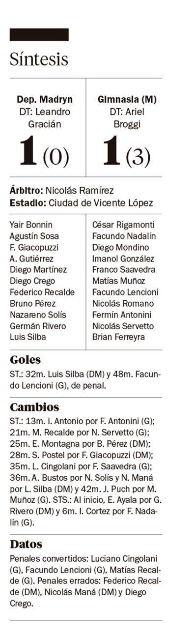 En la tanda de penales, la figura de Rigamonti emergió como el gran héroe. El arquero de Gimnasia contuvo los disparos de Federico Recalde y Nicolás Maná, mientras que Luciano Cingolani, Lencioni y Matías Recalde no fallaron y sellaron el triunfo por 3 a 0.