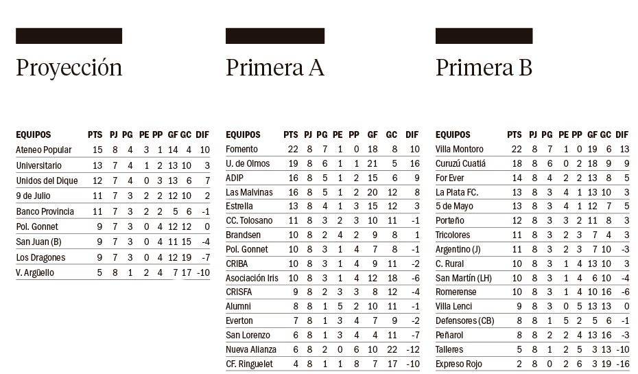 La Liga Amateur Platense pudo disputar su fecha sin inconvenientes. La octava fecha de los diversos torneos dejó a Fomento como líder en la divisional mayor, a Villa Montoro como puntero de la B y Ateneo manda en el Proyección a pesar del empate ante Universitario.