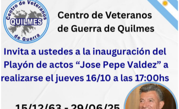 El Centro de Veteranos de Guerra de Quilmes inaugurará este jueves 16 de octubre, a las 17 horas, el playón de actos “José Pepe Valdez”. El espacio llevará el nombre de uno de los integrantes más recordados de la institución, quien falleció el 29 de junio de 2025. El acto contará con la presencia de autoridades locales, representantes de instituciones intermedias y vecinos que acompañarán a los veteranos en este tributo cargado de emoción y memoria colectiva.