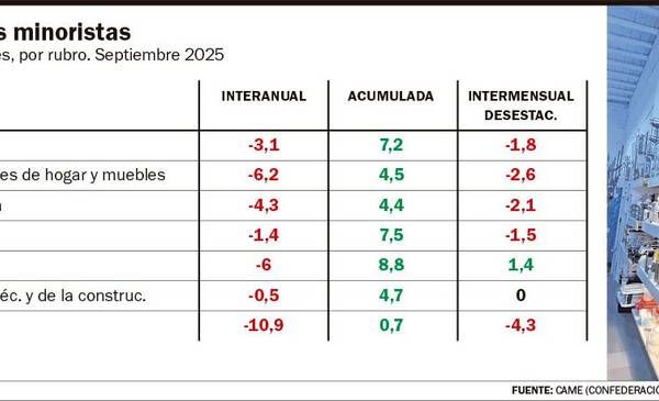 La Confederación de la Mediana Empresa nacional (CAME) advirtió que las ventas minoristas pymes registraron en septiembre una variación interanual a la baja del 4,2%, y un descenso mensual del 2% en relación a agosto. Mientras que perfumería y ferretería, materiales eléctricos y de la construcción, fueron los rubros que exhibieron un leve repunte (o por lo manos no cayeron), los demás estratos analizaron cayeron en valores mensuales y en comparación al 2024 (Ver gráfico).