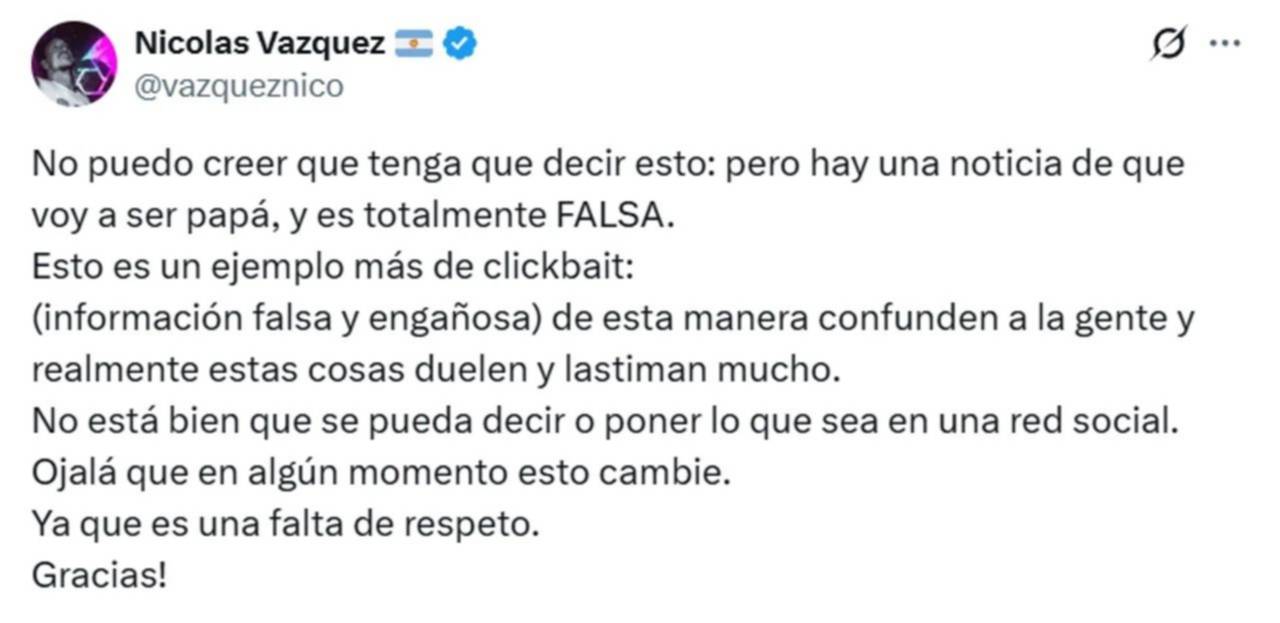 Nicolás Vázquez desmintió de manera categórica el rumor que circuló en las redes sociales sobre su supuesta futura paternidad junto a Dai Fernández, tras separarse de su esposa, Gimena Accardi, con quien estuvo en pareja durante casi dos décadas.