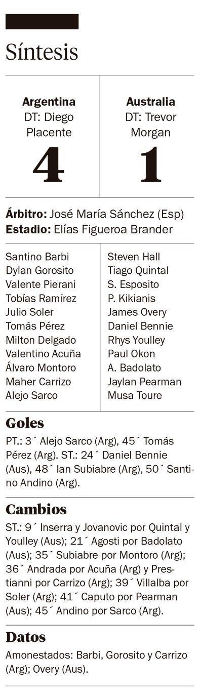 Recién en el minuto 45 logró convertir el 2-0: tras un buen desborde por izquierda, Carrizo asistió a Tomás Pérez, que convirtió dentro del área. En el complemento, Argentina desperdició chances claras con Montoro y por un blooper, Australia se puso en partido: a los 24´, luego de una mala salida y una pifia de Barbi, Daniel Bennie marcó el descuento.