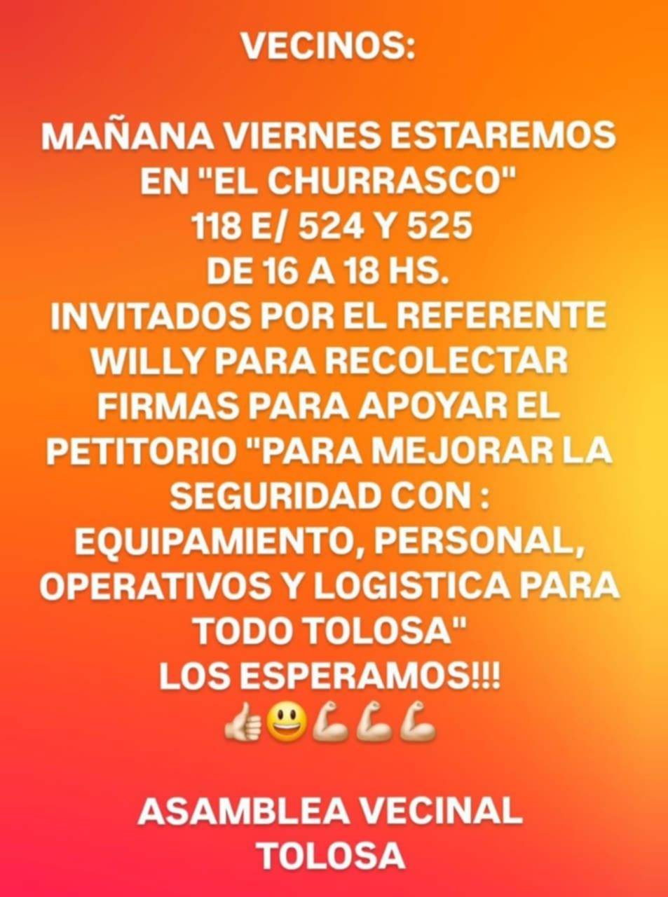 En los últimos días, la comisaría de Tolosa tuvo un cambio de autoridades, con un nuevo comisario a cargo. En este sentido, los frentistas se unieron para instalar mesas en todo el barrio y juntar firmas para “mejorar la seguridad con equipamiento, personal, operativos y logística para todo Tolosa”.