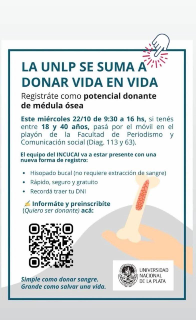 La Universidad Nacional de La Plata y el Incucai (Instituto Nacional Central Único Coordinador de Ablación e Implante) anunciaron una nueva campaña. Se trata de una jornada solidaria para registrar nuevos donantes de médula ósea.