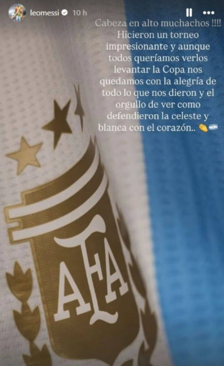 “¡Cabeza en alto, muchachos! Hicieron un torneo impresionante y aunque todos queríamos verlos levantar la Copa nos quedamos con la alegría de todo lo que nos dieron y el orgullo de ver cómo defendieron la celeste y blanca con el corazón”, escribió el crack en sus redes.