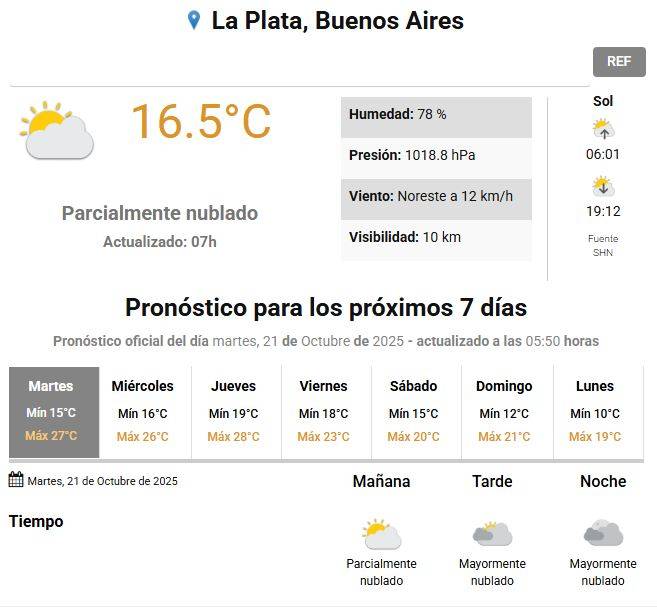 El tiempo se presentaba este martes en La Plata con cielo parcialmente nublado a mayormente nublado a partir de esta mañana, con vientos leves y temperatura mínima de 15 grados y máxima de 27, informó el Servicio Meteorológico Nacional (SMN).