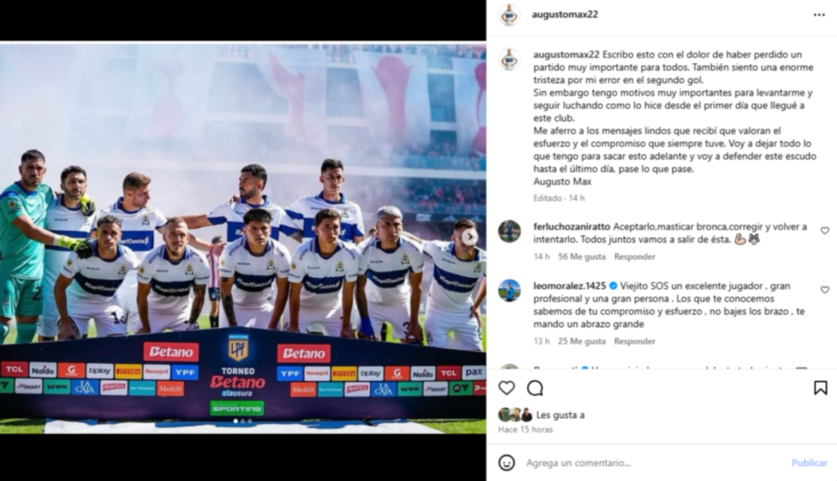Después de la dura derrota en el clásico platense, uno de los nombres más señalados fue el de Augusto Max (33). El mediocampista de Gimnasia fue protagonista involuntario en la jugada del segundo gol de Estudiantes, que sentenció el 2-0 en UNO. Sin embargo, lejos de esquivar la autocrítica, el jugador salió a dar la cara con un mensaje sentido en sus redes sociales.