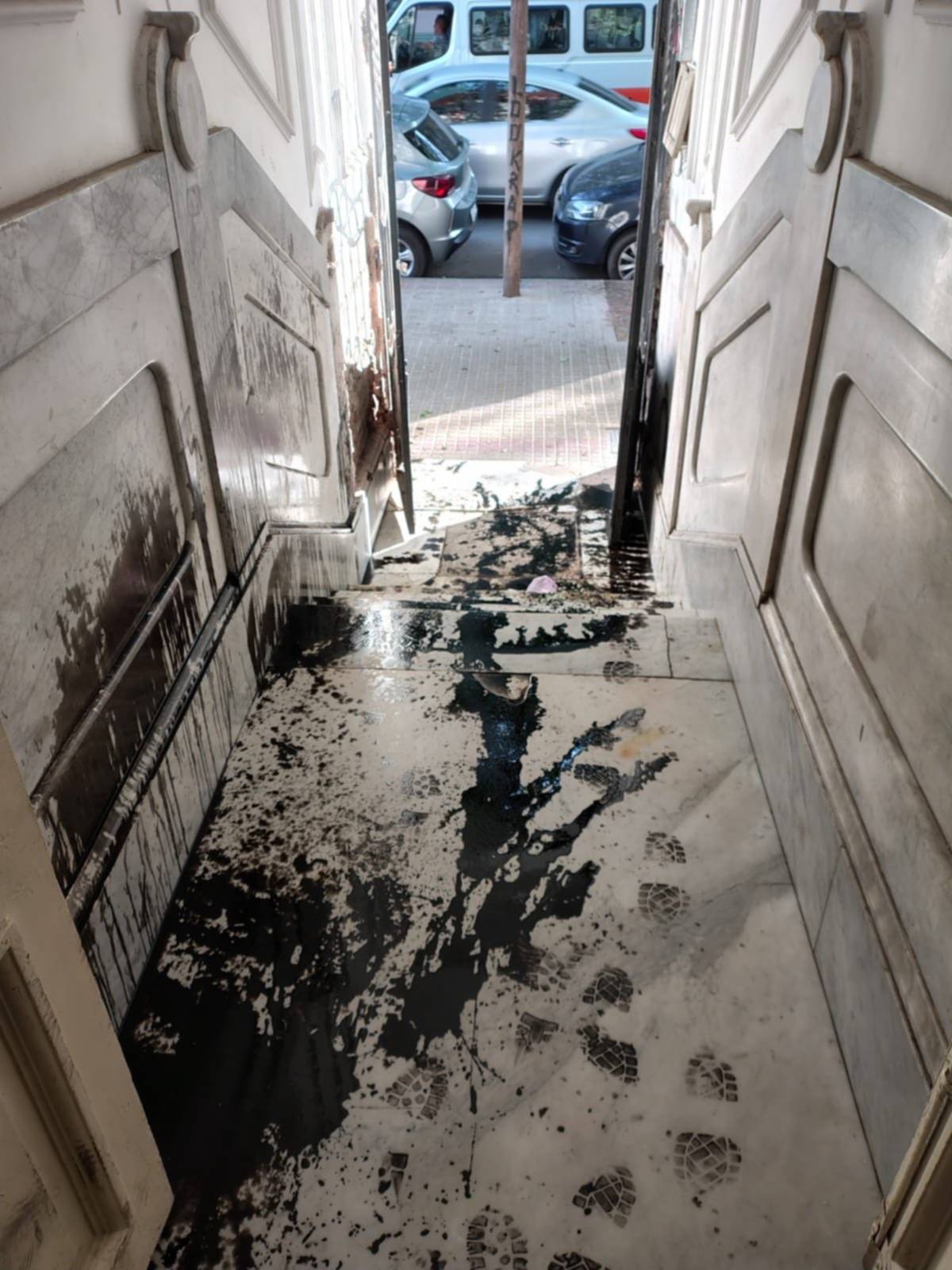 En las imágenes difundidas en redes sociales se observan pintarrajeadas y violentos mensajes en la fachada y daños en el pasillo de acceso, en donde arrojaron pintura en el piso y las paredes. Asimismo provocaron la rotura de la puerta principal.