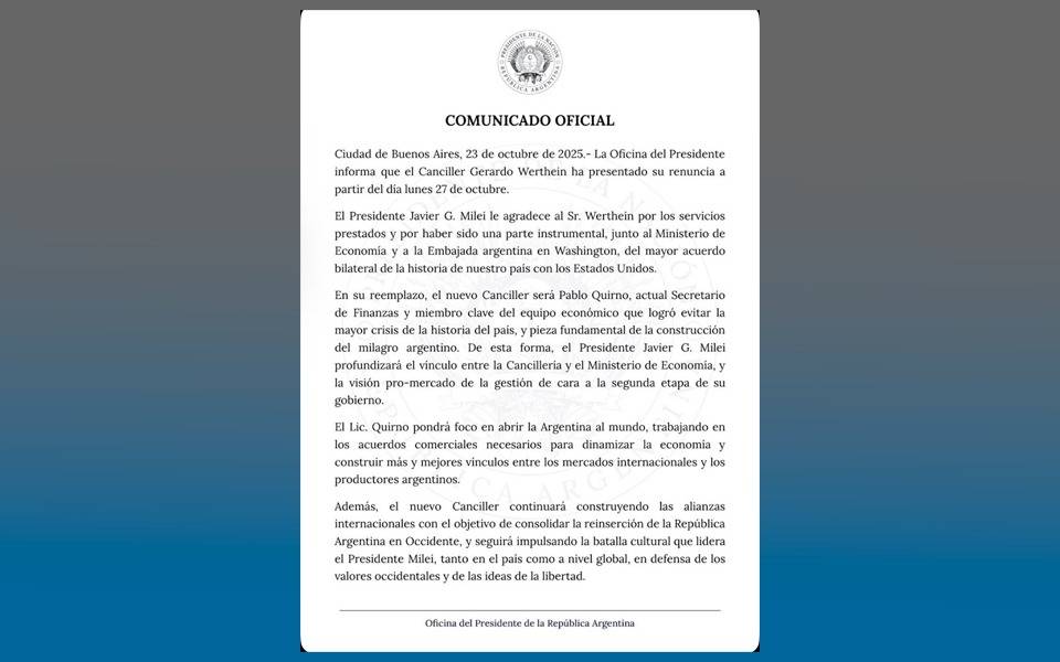 La Oficina del Presidente, a través de su cuenta de X, confirmó el enroque en el equipo de trabajo que rodea al mandatario pese a que el mandatario aseguró en las últimas horas que tomaría las definiciones el próximo domingo 26. “La Oficina del Presidente informa que el Canciller Gerardo Werthein ha presentado su renuncia a partir del lunes 27 de octubre”, sostuvieron.