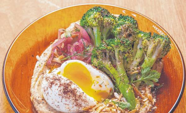 Un hummus de garbanzos clásico, realzado con brócolis asados a la perfección, una delicada salsa tahine, pickles de cebolla morada que aportan un contrapunto refrescante, almendras picadas y tostadas para un toque crocante, y coronado con un huevo cocido a 5 minutos, cuya yema cremosa se funde con cada bocado.