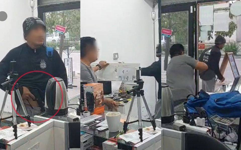 Toda la secuencia quedó grabada en una cámara del local. El episodio ocurrió cerca de las 18:30 de este jueves, en un negocio ubicado sobre avenida 32 entre 147 y 148. Según muestran las imágenes, el asaltante —que circulaba en bicicleta— ingresó al local vestido con un buzo oscuro de la Selección Argentina, un gorro gris y negro y pantalón gris.