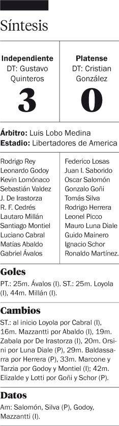 Independiente cortó su mala racha al golear por 3 a 0 a Platense y ganó por primera vez en el campeonato para volver a festejar después de 15 jornadas sin triunfos, en el partido postergado de la sexta fecha del Clausura.