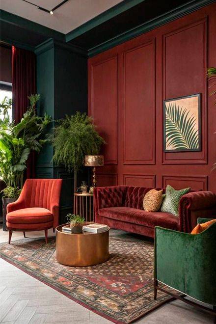 El color drenching no busca uniformar, sino intensificar. Las variaciones sutiles dentro de una misma familia cromática permiten que el espacio respire y conserve dinamismo. Una pared en tono oliva puede convivir con un sillón en verde musgo y cortinas en salvia, o una base terracota puede amplificarse con un techo en arcilla más clara y detalles en óxido. El resultado es una composición envolvente, sin contrastes bruscos, que invita a permanecer y observar.