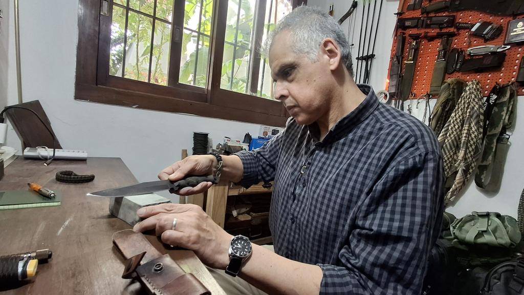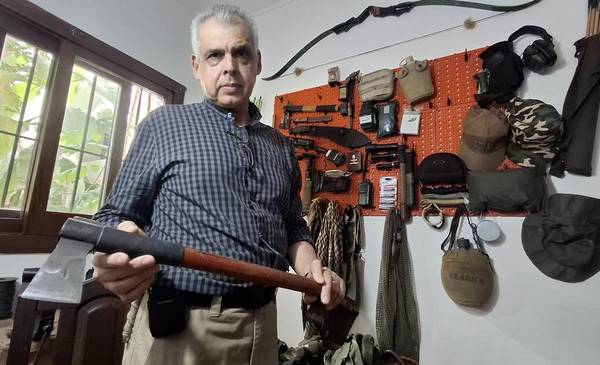 Explica que cada uno de los elementos que se ven cuidadosamente ubicados en paredes, mesas o repisas, tiene su función. Hay cantimploras, kits de traumas, pañuelos árabes, cuchillos, hachas y cachiporras, muchos de los cuales diseñó y fabricó él mismo. Tiene también armas de fuego, aunque no a la vista. Y arcos y flechas: “En la ciudad no sirven, pero me gusta practicarlo como deporte y es bueno saber usar armas primitivas porque quizás en la naturaleza debas improvisar para sobrevivir”, comenta.