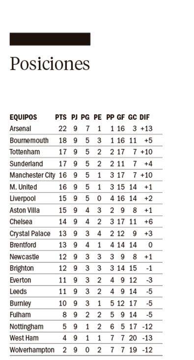 Por último, Tottenham, sin Cristian Romero por lesión, goleó 3-0 al Everton y se colocó en la tercera posición con 17 puntos, mismos que el Sunderland. Sarr y Ven por dos los goles de los Spurs.