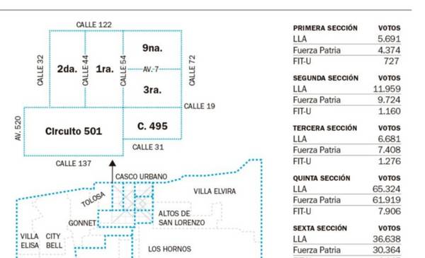La sexta sección electoral abarca Tolosa, Gonnet, City Bell, Villa Elisa y Gorina, entre otros barrios de la zona Norte. Allí LLA obtuvo 36.638 votos, mientras que FP logró 30.364. En casos puntuales dentro de esa sección, el peronismo obtuvo la mayoría de los votos dentro de dos circuitos de la zona norte -el 505A y el 505B-, donde sacó 3.605 votos sobre 3.204 de los libertarios y 1.032 frente a 963 sufragios.
