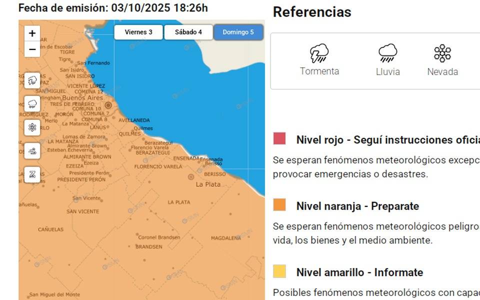 El Servicio Meteorológico Nacional elevó a NARANJA el alerta por fuertes tormentas para La Plata y todos los municipios de la Región (ver imagen).