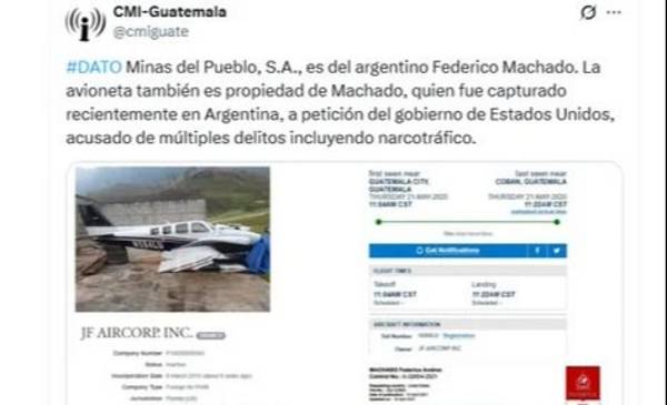El tuit clave, que data de mayo de 2020, proviene de la cuenta CMI-Guatemala (@cmiguate), que en su biografía se define como un medio dedicado al "Mapeo de redes de poder" y parte de la red global de Indymedia. La publicación es contundente: "#DATO Minas del Pueblo, S.A., es del argentino Federico Machado. La avioneta también es propiedad de Machado, quien fue capturado recientemente en Argentina, a petición del gobierno de Estados Unidos, acusado de múltiples delitos incluyendo narcotráfico".