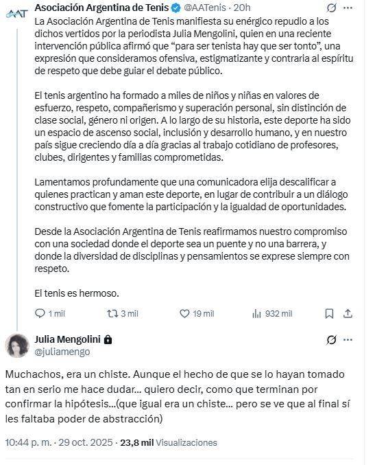 Ante el revuelo generado por las declaraciones de la conductora, la Asociación Argentina de Tenis (AAT) emitió un comunicado oficial en el que expresó su enérgico repudio: “La Asociación Argentina de Tenis manifiesta su enérgico repudio a los dichos vertidos por la periodista Julia Mengolini, quien en una reciente intervención pública afirmó que ‘para ser tenista hay que ser tonto’, una expresión que consideramos ofensiva, estigmatizante y contraria al espíritu de respeto que debe guiar el debate público”.