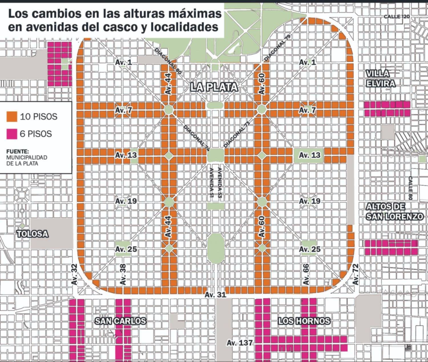 Otra novedad que trae el proyecto del nuevo código es la flexibilización de los topes de las alturas en las avenidas de las localidades. Por ejemplo, en las avenidas 60 y 137, en Los Hornos, y en la 44, en San Carlos, se permitirá elevar las edificaciones hasta seis niveles, en lugar de los tres que se autorizan actualmente. Lo mismo ocurriría en algunas avenidas de Tolosa. En las manzanas simples de los barrios, en tanto, el tope continuará siendo de tres pisos.
