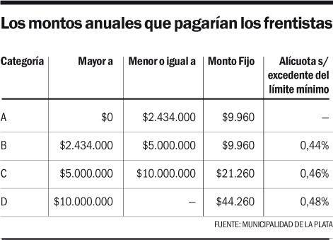 Para la categoría A, que comprende a los inmuebles que tienen una valuación fiscal de hasta 2.434.000 pesos, que pasará a tener un monto fijo anual de 9.960 pesos, sin “alícuota sobre el excedente del límite mínimo”. La categoría B, que abarca las valuaciones que van desde los 2.434.000 pesos a los 5.000.000, tiene asignado en la tabla el mismo monto, aunque se le añade esa alícuota para inmuebles que revisten condiciones de “irregularidad”, del 0,44 por ciento.