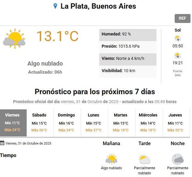 El viernes se presentaba en La Plata con cielo algo nublado a parcialmente nublado, vientos leves y temperatura mínima de 11 grados y máxima de 24, informó el Servicio Meteorológico Nacional (SMN).