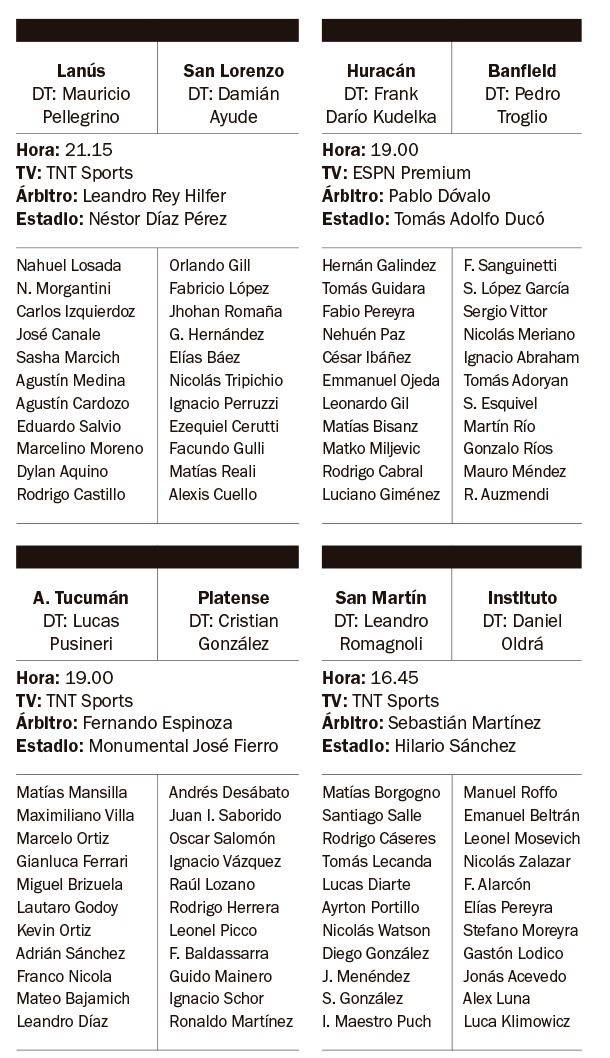 Lanús y San Lorenzo se enfrentan esta noche desde las 21.15 en el Estadio Néstor Díaz Pérez, en un partido clave por la clasificación a los playoff del Torneo Clausura. A su vez, en simultáneo desde las 19 Huracán recibe a Banfield, en tanto que Atlético Tucumán hará lo propio ante Platense. Más temprano, San Martín (SJ) e Instituto a las 16.45.