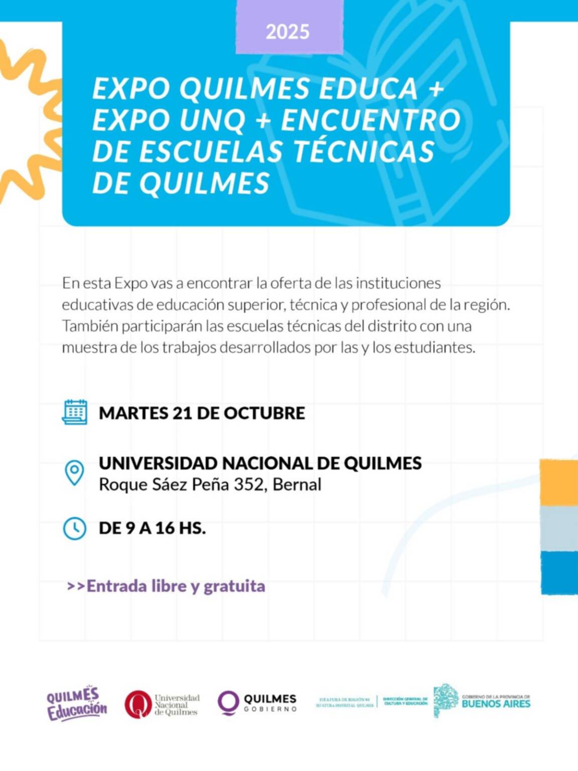 El martes 21 de octubre de 2025, la Expo Quilmes Educa se presentará en la Universidad Nacional de Quilmes (UNQ) junto a las propuestas de la 8° edición de la EXPO UNQ.