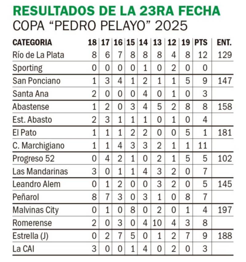 Hablando de triunfos, en la fecha del último sábado tuvieron una buena cosecha de puntos varios equipos, como por ejemplo, Río de La Plata; San Ponciano, Abastense Argentino, Círculo Marchigiano, Las Mandarinas, deBrandsen, Peñarol y Estrella de Jeppener.