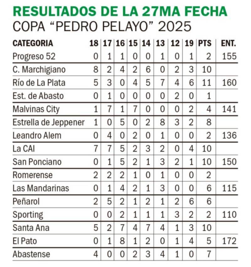 En el marco de la fecha 27 de la Copa Pedro Pelayo, organizada por la Liga del Oeste, cuatro equipos consiguieron ganar en la sumatoria general por “diez” puntos.