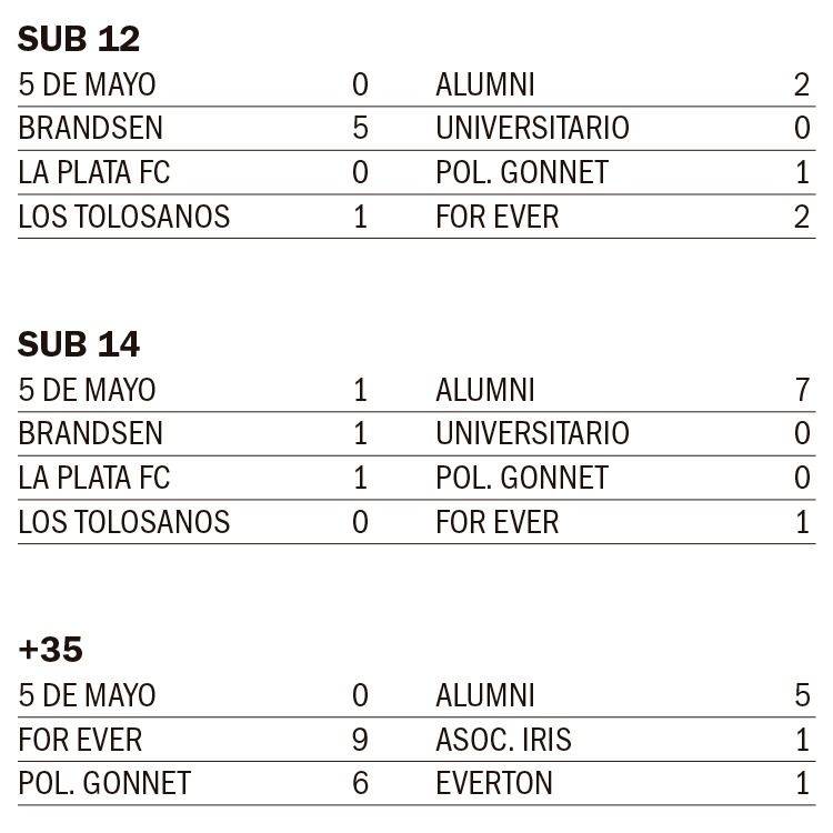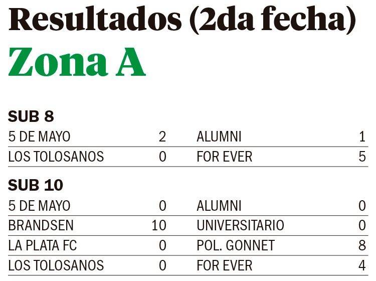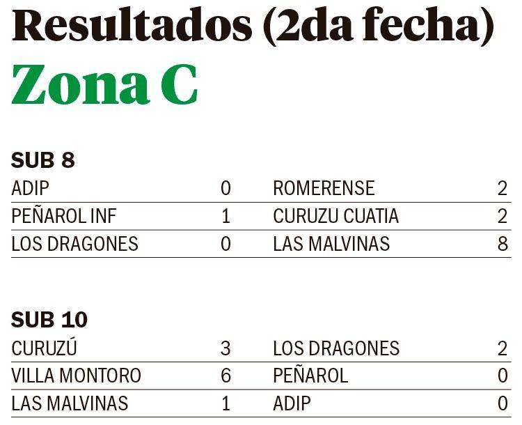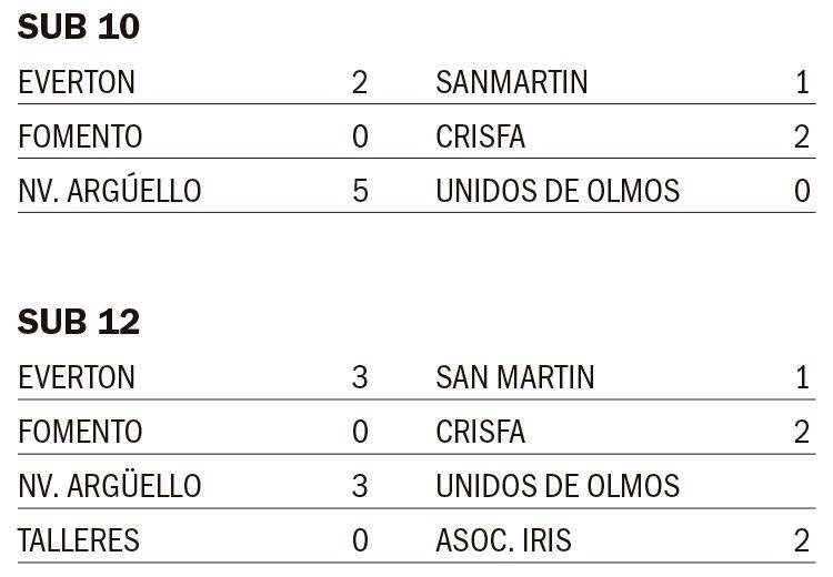 Por ejemplo, en la Zona A, la Sub 10 de Brandsen le hizo ¡10! a Universitario. Mientras que la Sub 12 del Coronel se impuso claramente 5-0 a Universitario. En la Zona B, la Sub 10 de NV. Argüello le hizo 5 a Unidos de Olmos. Y en la Zona C, la Sub 10 de Villa Montoro superó 6-0 a Peñarol.