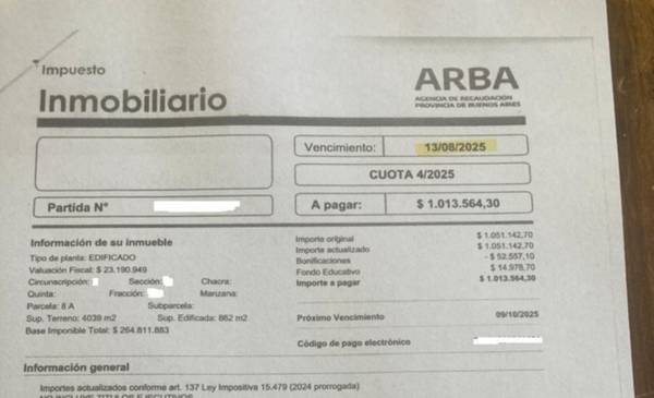 Crece la bronca de los contribuyentes bonaerenses por el cobro de la “quinta” cuota de los impuestos inmobiliario urbano y rural de ARBA, que se aplica para las partidas de mayor valuación. Tal como informó EL DIA, el malestar se da porque en el caso del urbano, se aplica cuando la base imponible del inmueble supera los $31.465.000 y en el rural, corresponde cuando la base imponible de tierra libre de mejoras supera los $39.096.756, según estipula la ley fiscal bonaerense aprobada en 2024, la última que está vigente.