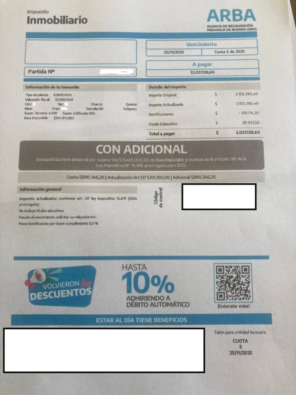 Lo cierto es que vecinos platenses trajeron a la redacción del diario las boletas con la aclaración de ARBA en donde un cartel advierte que no se trata de un aumento sino de un "adicional". El mensaje en letras grandes avisa que la misma tiene "un adicional" y más chico se aclara que "esta partida supera los $31.465.000 de base imponible previstos en el artículo 138 de la Ley Impositiva Nº 15.479, prorrogada para 2025".