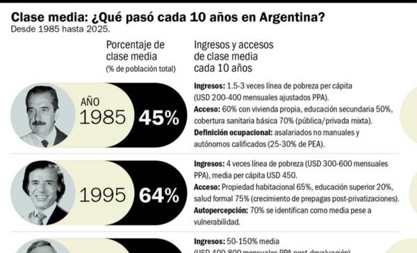 La clase media argentina concentró durante gran parte del siglo XX el ideal de progreso, estabilidad y movilidad ascendente. Fue sinónimo de educación, consumo sostenido y acceso a vivienda. Pero ese lugar central cambió de manera marcada en las últimas cuatro décadas. Un análisis elaborado por la consultora Focus Market reconstruyó la evolución del segmento cada diez años, desde 1985 hasta 2025, en el que exhibe una trayectoria irregular que acompaña la volatilidad estructural de la economía.