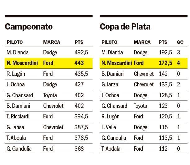 En ese sentido, con el segundo puesto de La Pampa, pasó a escoltar a Dianda quien le lleva 49,5 puntos dejando atrás Rodrigo Lugón (Ford) por 7,5 unidades. En tal sentido, Moscardini, a pesar de no poder ascender al Turismo Carretera por la “Copa de Plata” lo podría lograr por medio del subcampeonato; aunque hay otra posibilidad que es por “mérito deportivo”.